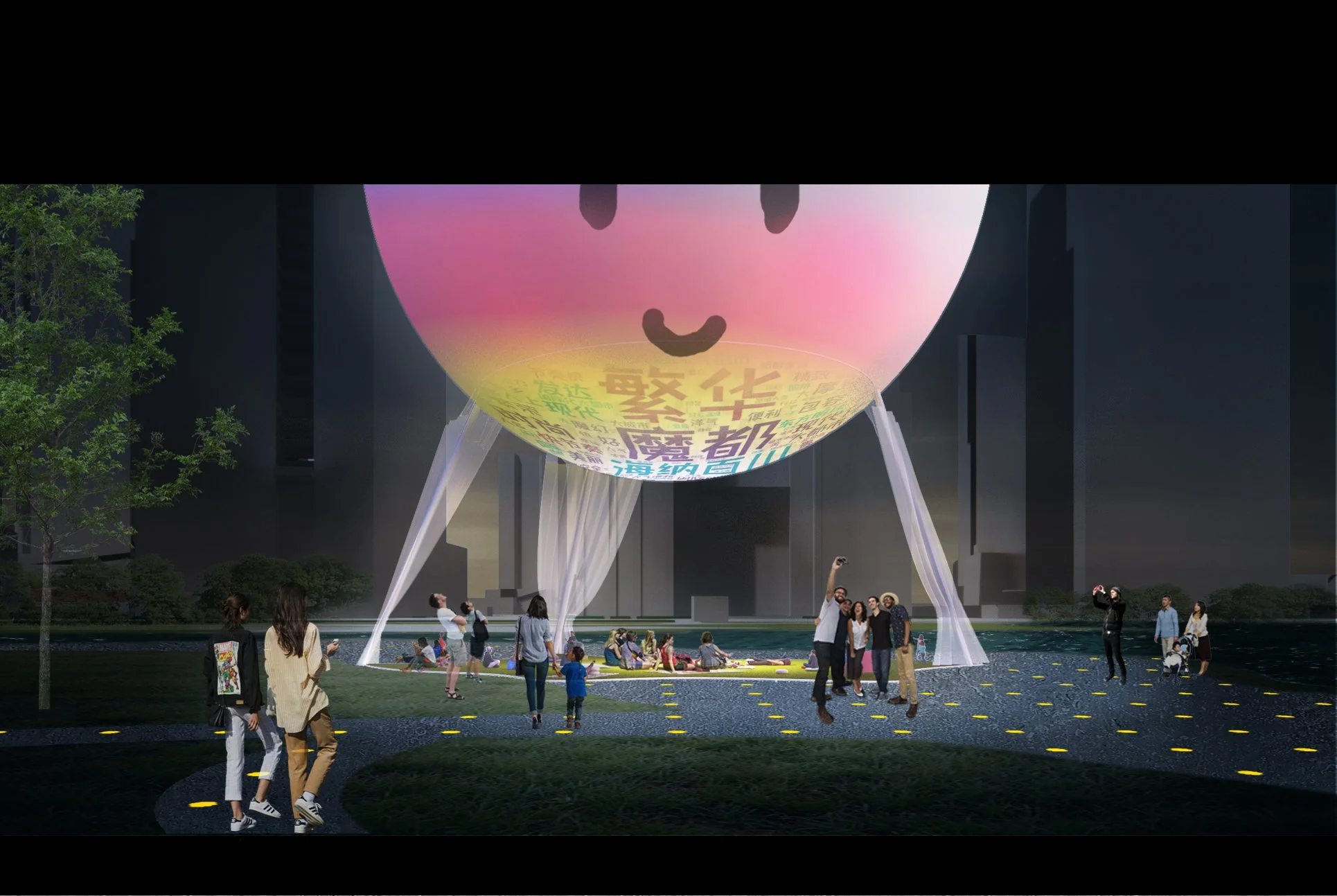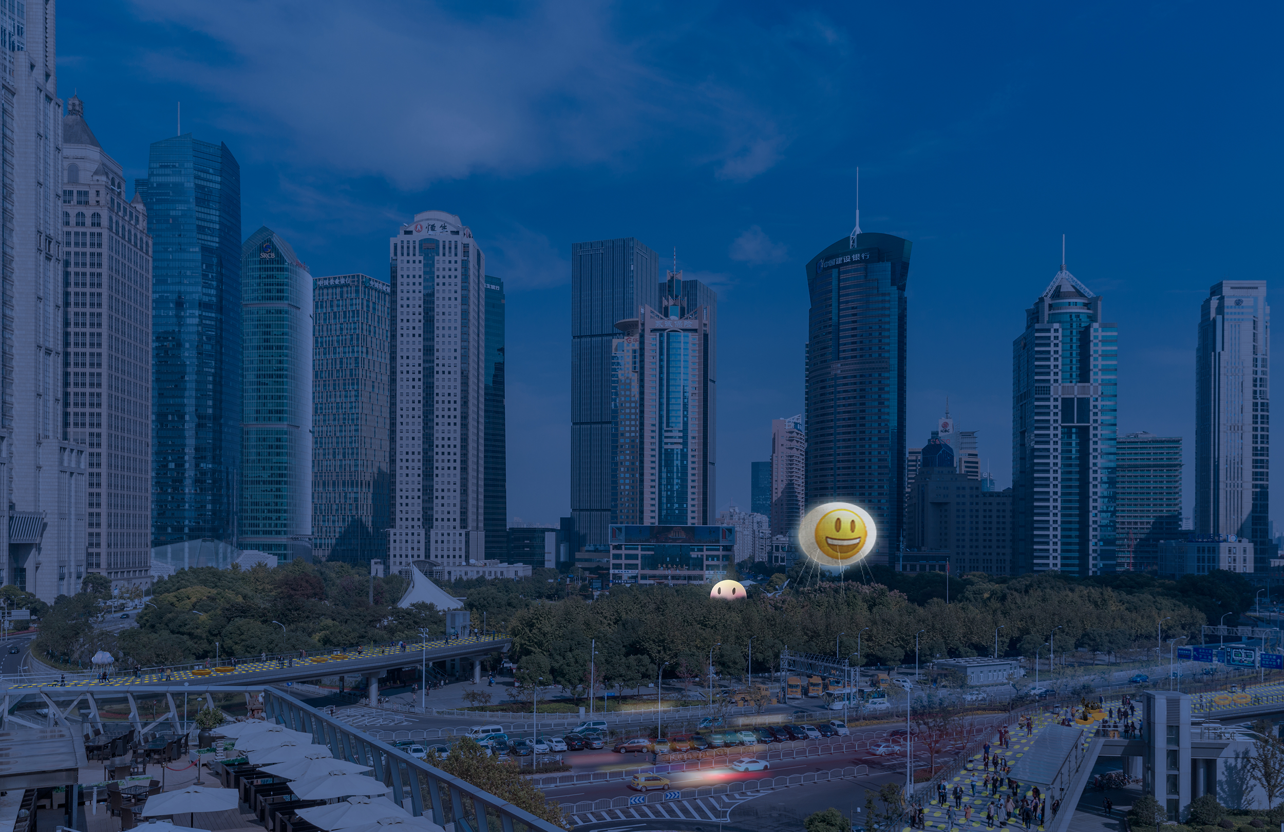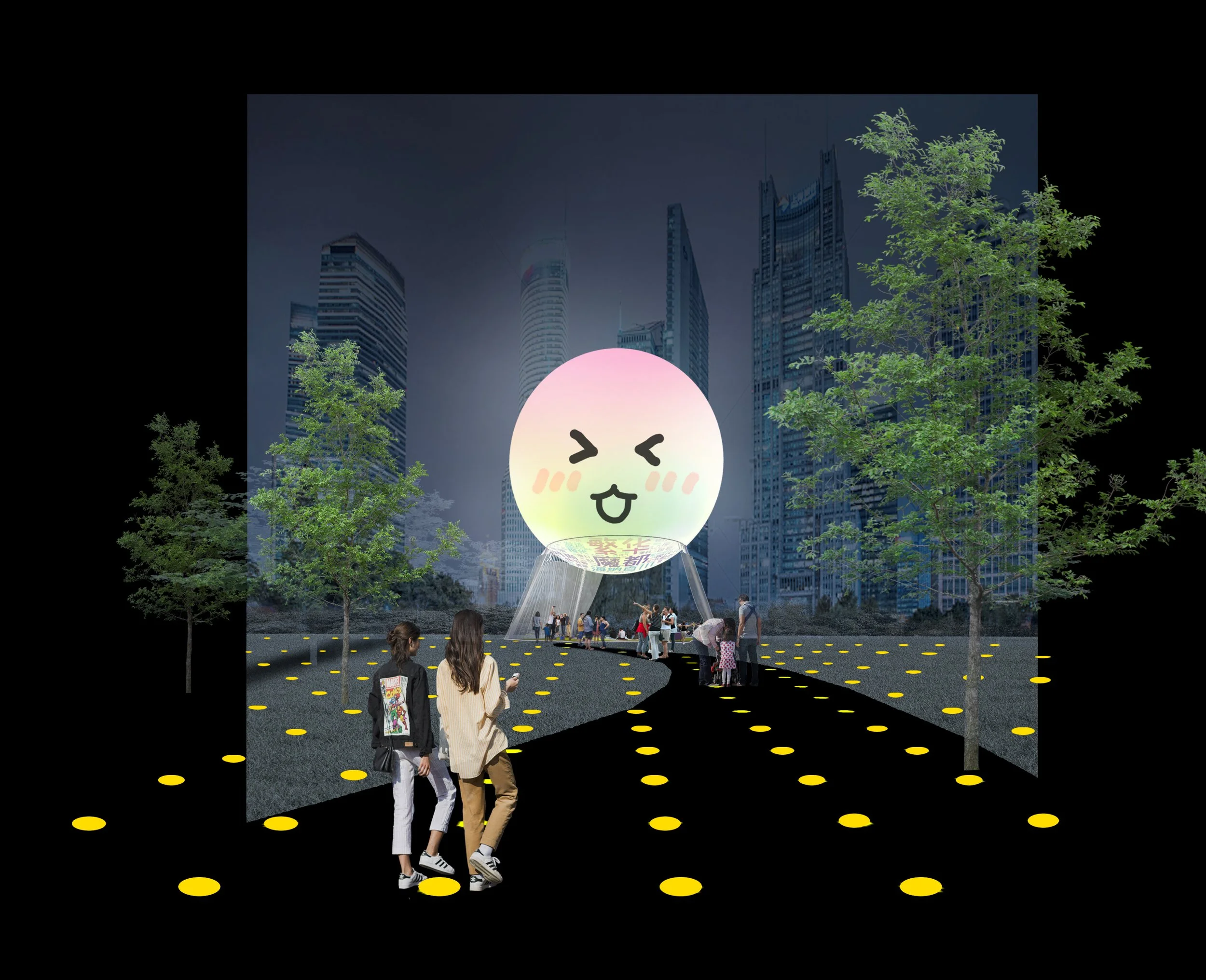 TO SHOWCASE: A 20-meter-diameter emoji balloon floats at night in the green space in the center of Lujiazui to locate an anchor point for the large-scale park. There is a projector in the center of the balloon. Everyone can interact with the balloon through a digital platform. Users can send particular expressions to the projector, to be showcased for ten seconds. This allows residents, workers and tourists to express their feelings and become a part of the context. The balloon caters to all types of users. Working overtime until midnight is not rare in Lujiazui. After 9 o’clock, in addition to an email, client’s pressure, and colleagues’ similarly anxious eyes, you can also find a balloon smiling at you outside the window. The balloon aims to bring warmth and human touch to this cold financial center.