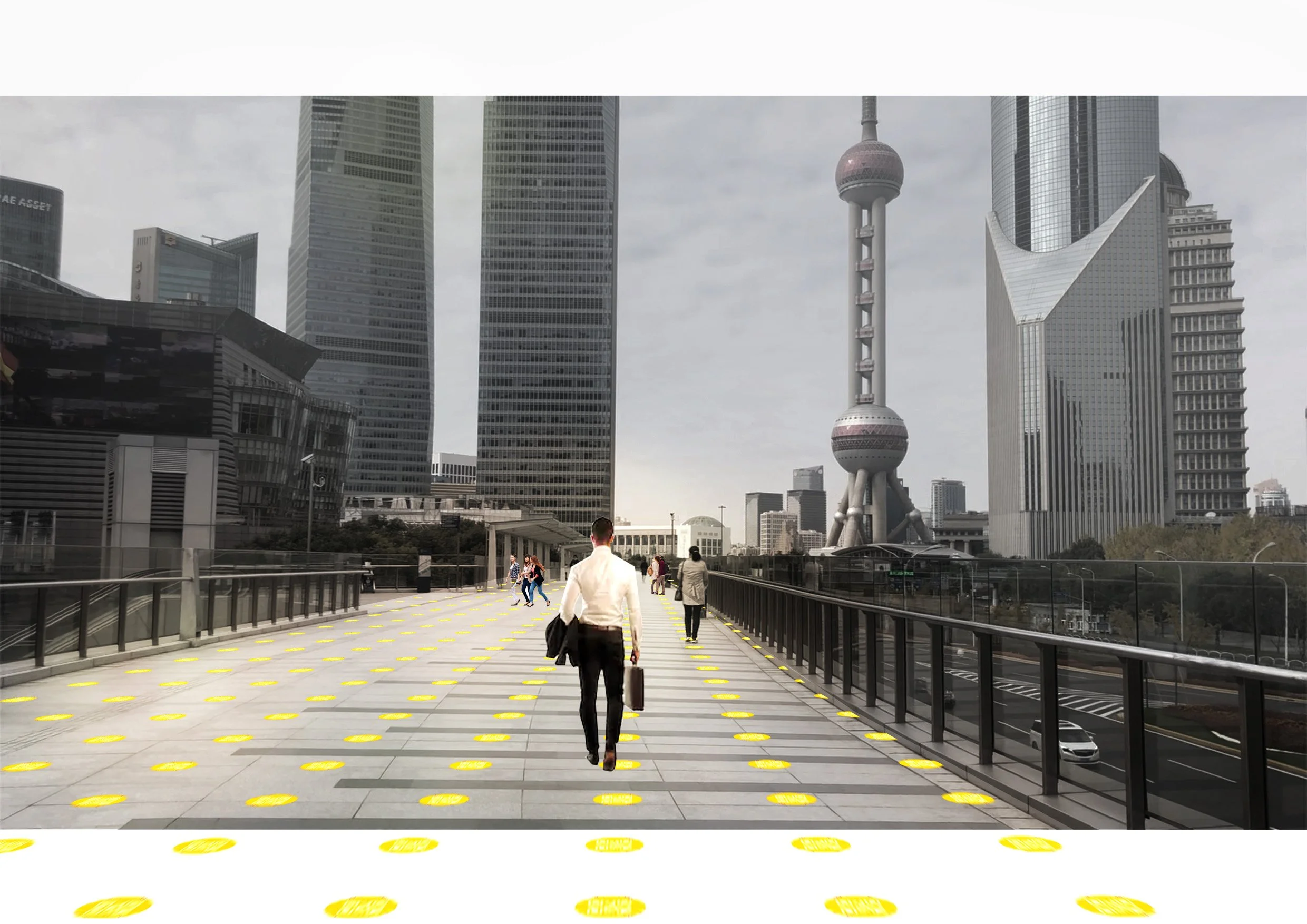 TO OWN: Cities are based on movement. Yet architecture and urban planning continue to focus on inscribing ideas into static blueprints. The design to manage all risks beforehand is stronger than the confidence in the power of direction during the process. Thus it loses the motivation of people to participate in urban renewal. We draw a generic grid mapping on both test sites that invite the public to join in this social discussion and start to build up a local community. Each yellow dot represents 10 people working in Lujiazui. Together it creates a connected temporary network on the site. It is also a protest in the public space to empower the citizens with a sense of belonging.